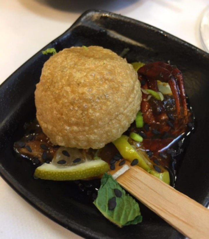 El siguiente plato ya era el acabose: una pata de cangrejo acompañada de una bola en la que había dentro una cucaracha. Ese fue mi límite. Por ahí no paso. Ya solo podía pensar en Cucal y en los veranos en el pueblo de mi madre, cuando esos seres infectos echaban a volar en el patio como un Boing 707 a punto de chocar contra cualquier cosa.