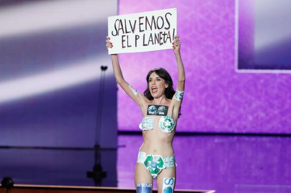 “Gracias por el mensaje tan coherente ‘Salvemos el Planeta’, aunque en lugar de sermones (que ya no solo los da la Iglesia Católica) le pediría más coherencia entre lo que se proclama y se hace”, señaló en referencia al momento en el que una falsa espontánea —la actriz Paula Meliveo— irrumpió en la gala semidesnuda con pegatinas por el cuerpo y el cartel con ese lema medioambiental.