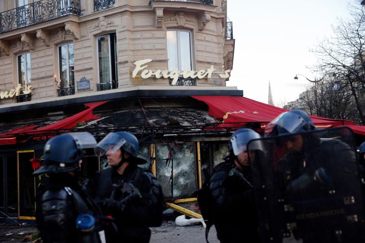 Según Philippe, 124 comercios en París sufrieron destrozos este sábado pasado y 27 fueron objeto de pillajes. El más emblemático de todos fue el restaurante Le Fouquet’s, símbolo del lujo en París.