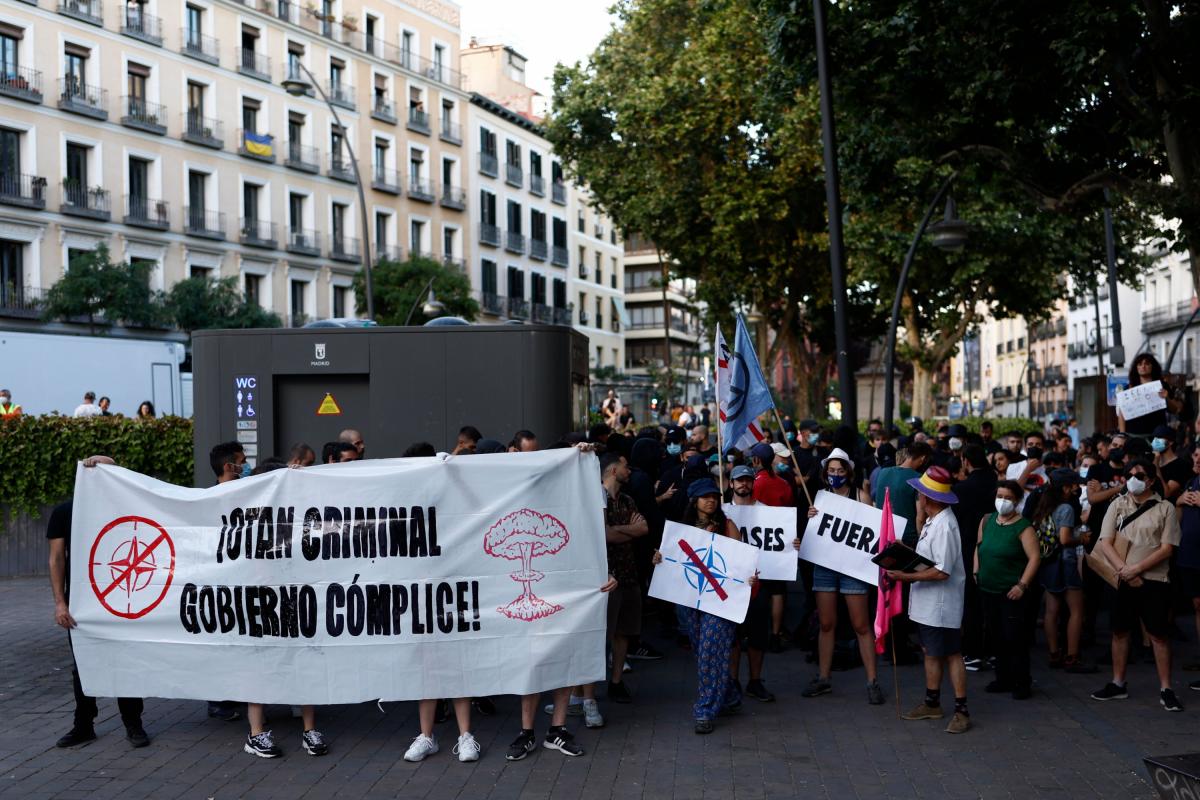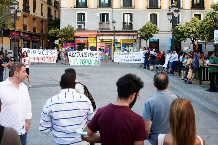 Convocados por el Movimiento Antirrepresivo de Madrid, decenas de activistas, algunos de ellos encapuchados, han empezado a concentrarse alrededor de las 20 horas en la Plaza de Tirso de Molina de Madrid, donde han alzado una pancarta con el mensaje “OTAN criminal, Gobierno cómplice”.