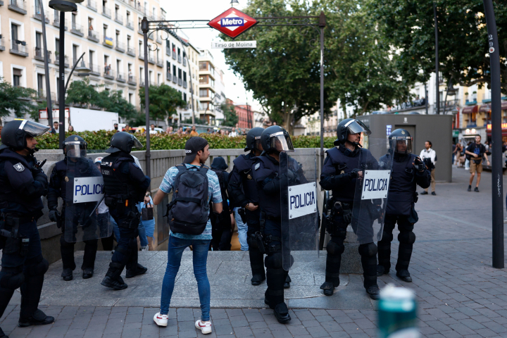 La protesta, vigilada en todo momento también por un helicóptero y dos drones, ha transcurrido con tranquilidad, si bien la tensión entre los activistas y los agentes ha sido patente y en un momento los antidisturbios han formado dos líneas de defensa a las salidas de la plaza poco antes de disolver la concentración.