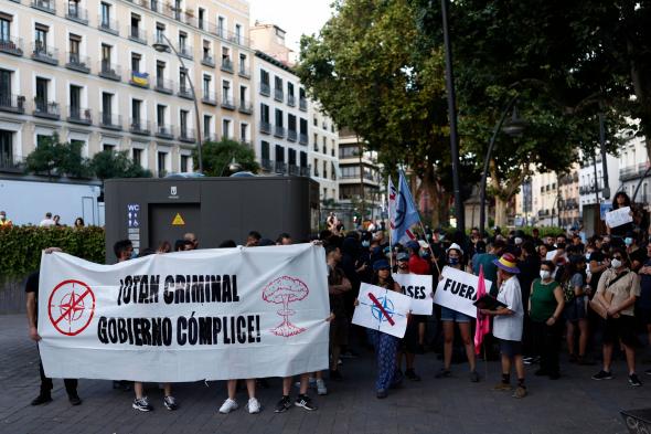 Convocados por el Movimiento Antirrepresivo de Madrid, decenas de activistas, algunos de ellos encapuchados, han empezado a concentrarse alrededor de las 20 horas en la Plaza de Tirso de Molina de Madrid, donde han alzado una pancarta con el mensaje “OTAN criminal, Gobierno cómplice”.