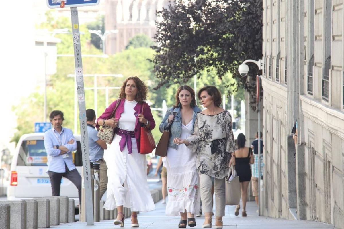 Le acompañan la ministra de Hacienda en funciones, María Jesús Montero, y la portavoz socialista en el Congreso, Adriana Lastra.
