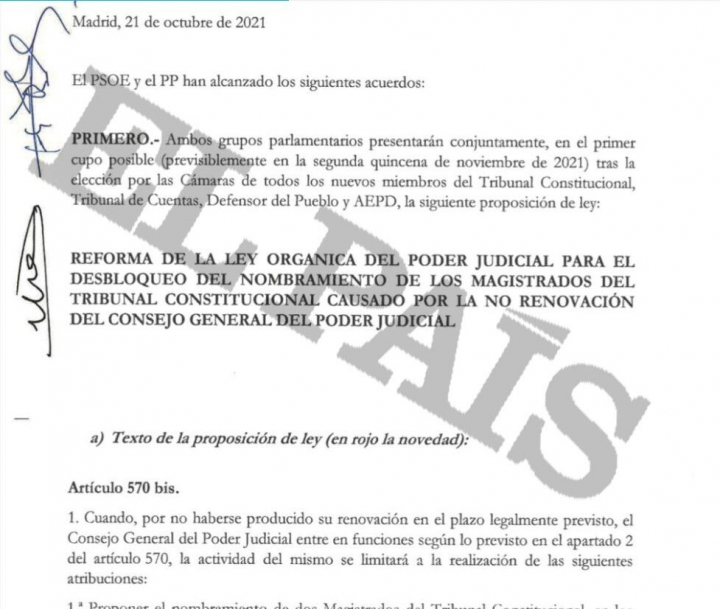 Este martes, El País ha publicado dicho acuerdo que quedó por escrito y en el que ambos grupos se comprometían a presentar “previsiblemente en la primera quincena de noviembre” la reforma de la Ley Orgánica del Poder Judicial para el desbloqueo del nombramiento de los magistrados del Tribunal Constitucional causado por la no renovación del CGPJ.