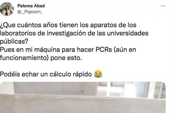 “Que cuántos años tienen los aparatos de los laboratorios de investigación de las universidades públicas? Pues en mi máquina para hacer PCRs (aún en funcionamiento) pone esto. Podéis echar un cálculo rápido”, ha escrito, junto a la imagen del cartel.