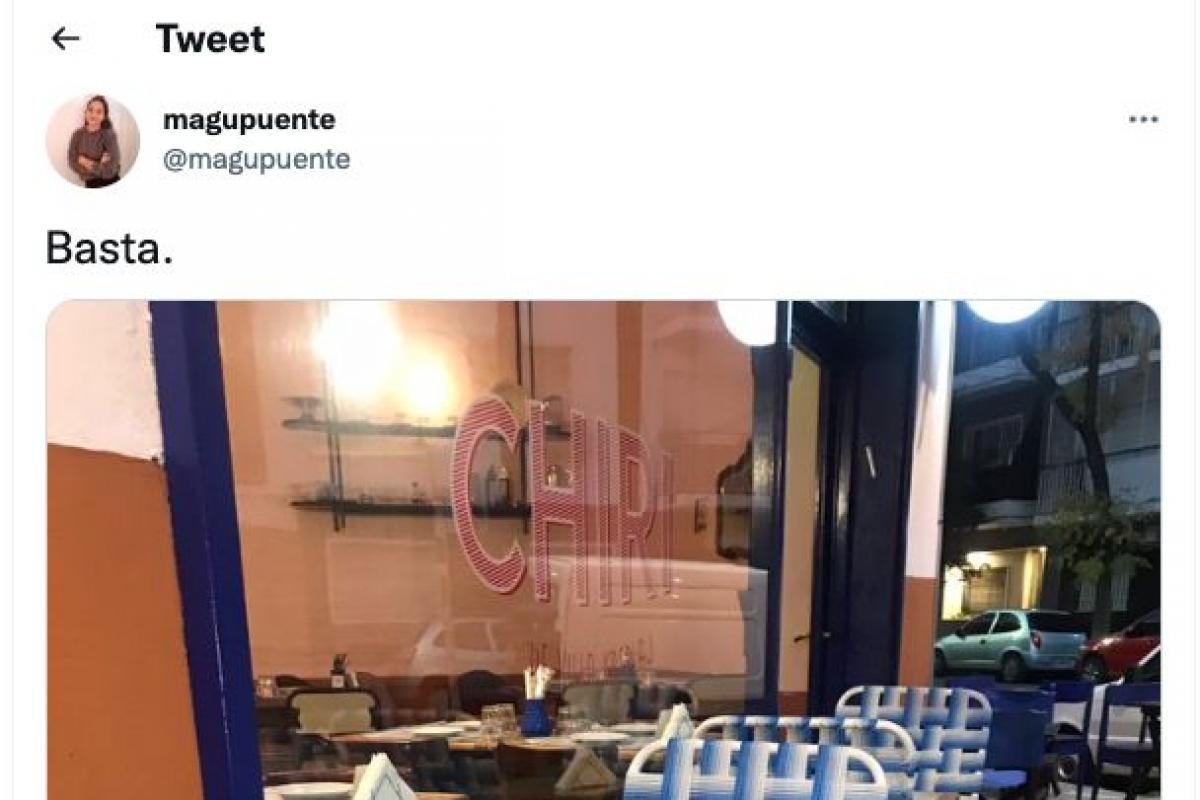 El local en cuestión es El Chiri de Villa Kreplaj, en Buenos Aires, la capital de Argentina. La usuaria ha escrito un simple “basta” junto a la instantánea, en la que se ve cómo el restaurante ha colocado sillas plegables, como las típicas de camping o playa, junto a las mesas.