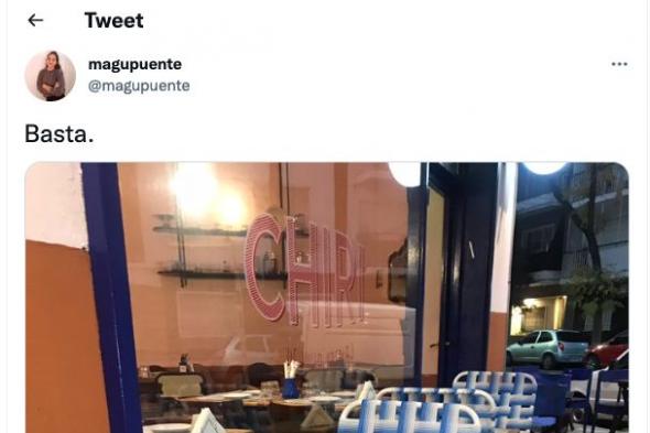 El local en cuestión es El Chiri de Villa Kreplaj, en Buenos Aires, la capital de Argentina. La usuaria ha escrito un simple “basta” junto a la instantánea, en la que se ve cómo el restaurante ha colocado sillas plegables, como las típicas de camping o playa, junto a las mesas.