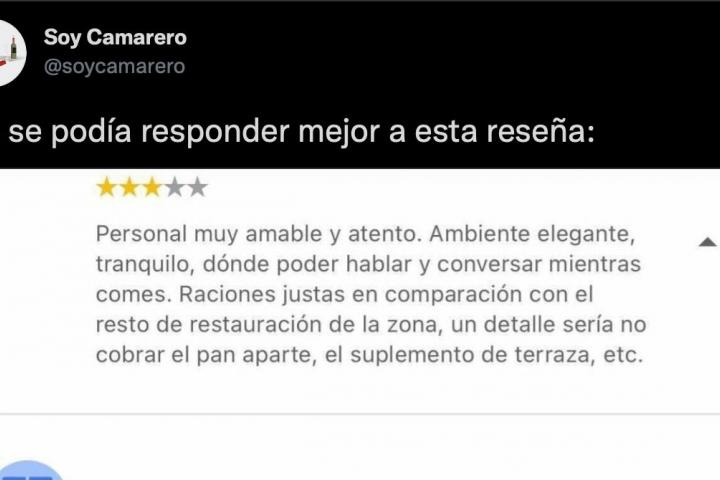 La cuenta Soy Camarero se encarga de recopilar en sus redes sociales este tipo de comentarios. Este sábado ha compartido en Twitter uno de esos intercambios, que ha publicado junto a la siguiente frase: “No se podía responder mejor a esta reseña”.