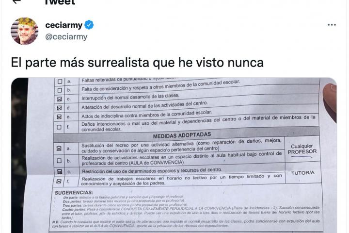Ahora, este perfil ha compartido “el parte más surrealista que he visto nunca”. Tan curioso ha sido este parte de expulsión que ha recibido un alumno que lleva en una hora más de 8.000 ‘me gusta’, es decir, va camino de lograr importantes números de difusión en la red social del pájaro azul.