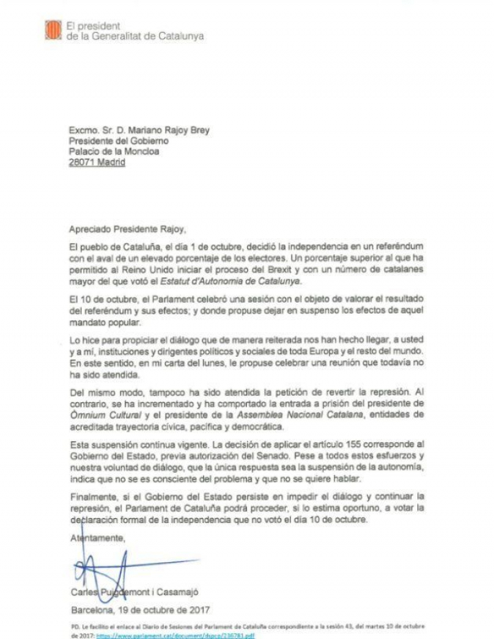 La carta es de un folio, más corta que la del pasado lunes. En ella, el president explica que el 1 de octubre el pueblo de Cataluña "decidió la independencia en un referéndum con el aval de un elevado porcentaje de los electores", "superior al que ha permitido al Reino Unido iniciar el proceso del 'brexit' y con un número de catalanes mayor del que votó el Estatut".