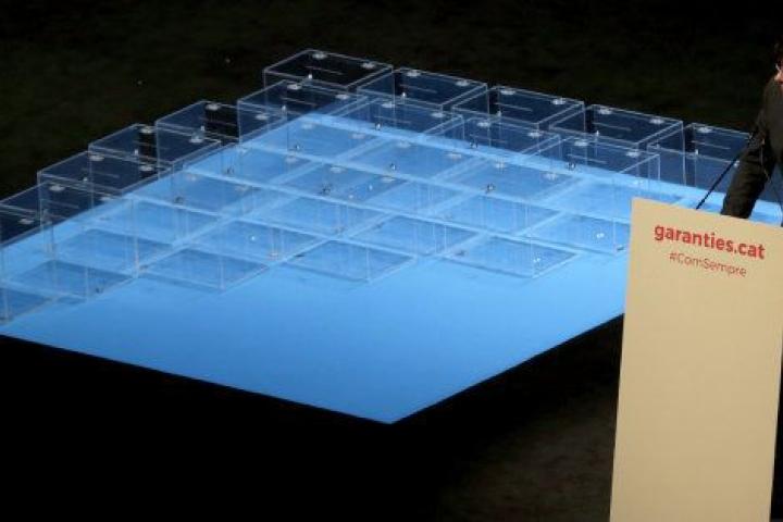 Carles Puigdemont, Oriol Junqueras, el gobierno en pleno de la Generalitat y, en el suelo del Teatre Nacional de Catalunya (TNC), a sus pies, urnas vacías. Más de una decena, como una metáfora del derecho a decidir y como la imagen simbólica de ese referéndum del 1 de octubre en el que los soberanistas se lo juegan todo.