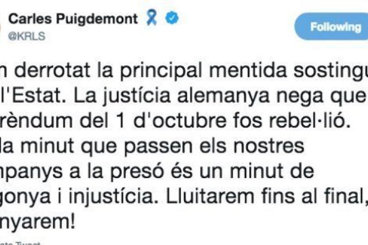 "Hemos derrotado la principal mentira sostenida por el Estado. La justicia alemana niega que el referéndum del 1 de octubre fuera rebelión. Cada minuto que pasan nuestros compañeros en prisión es un minuto de vergüenza e injusticia. ¡Lucharemos hasta el final, y ganaremos!", ha escrito el expresident.