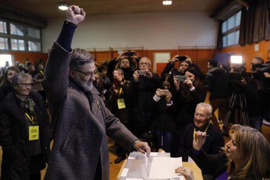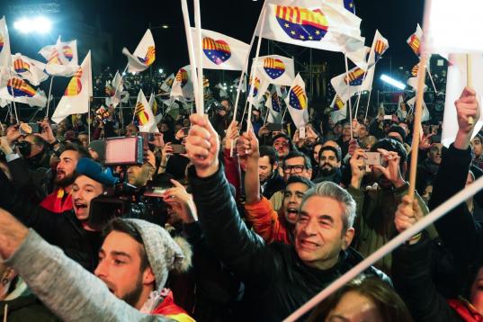 Dos grandes pantallas iban mostrando la retransmisión de TV3 con la evolución del recuento. La montaña rusa se veía en las caras de los presentes: la subida brutal de Cs, la remontada, las sumas que salen o no salen, la sonrisa apenas disimulada al ver cómo acababa el PP... Con las idas y vueltas, los rumores cambiaban: Puigdemont va a comparecer después de sus compañeros en Cataluña; no, lo hará solo, única voz, como president del Gobierno legítimo; comparece con la gente de ERC también; no, lo harán por separado, como separados han ido a las urnas... Todo eso saltó por los aires conforme sumaban los escaños. De pronto, parecían de nuevo una lista única.