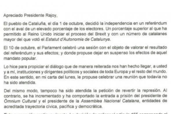 "En mi carta del lunes le propuse celebrar una reunión que todavía no ha sido atendida", añade Puigdemont. El requerimiento es un paso previo a que el Gobierno central pueda aplicar el artículo 155 de la Constitución y suspender así la autonomía de Cataluña: para Puigdemont, eso "indica que no se es consciente del problema y que no se quiere hablar".