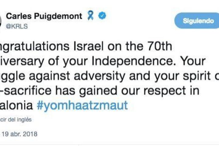 Carles Puigdemont ha felicitado en su cuenta de Twitter a Israel por el "70 aniversario de su independencia". "Vuestra lucha contra la adversidad y vuestro espíritu de auto-sacrificio se ha ganado nuestro respeto en Cataluña", ha escrito en inglés el expresident catalán huido.