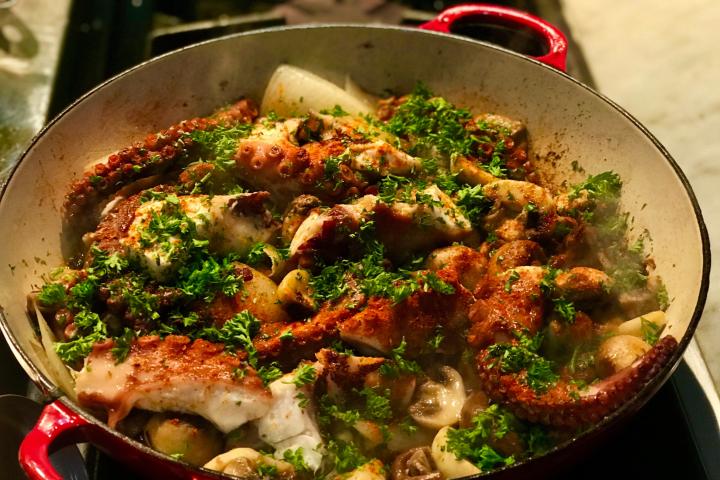 Espolvorear con las hierbas picadas. Rectificar el sazonamiento y dar un ligero hervor teniendo la precaución de no secar los tentáculos de pulpo. Servir con patacón frito.