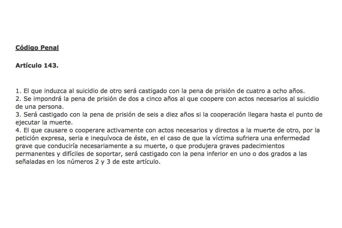 A falta del acuerdo parlamentario para despenalizar la eutanasia, el Código Penal recoge en su artículo 143 una serie de supuestos para castigar a quien induzca al suicidio de otro o a quien coopere con el mismo.