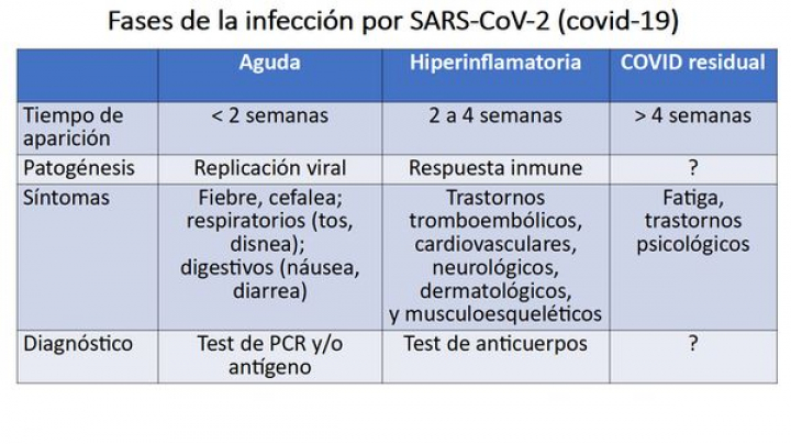 A las dos fases clínicas de la covid-19 arriba descritas, se ha sumado una fase 3. Esta agrupa complicaciones tardías y un cuadro residual conocido como síndrome poscovid tras un mes de padecer la infección aguda.