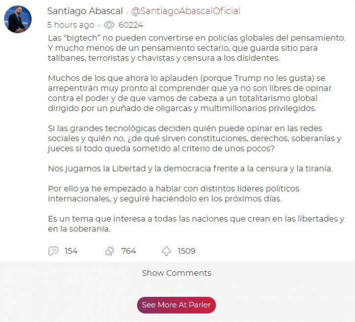 En España, a Parler le han salido varios ‘influencers’ de renombre. Santiago Abascal, Bea Fanjul o Juan Carlos Girauta han hecho campaña a favor de esta red y sacan músculo por sus crecientes conexiones en ella.