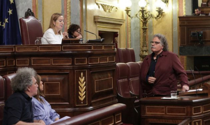 Joan Tardà lleva desde hace unos días su brazo derecho sujeto por un cabestrillo. Así ha subido a la tribuna de oradores en el Congreso este jueves y ha asistido a varias manifestaciones a favor del referéndum en Cataluña.