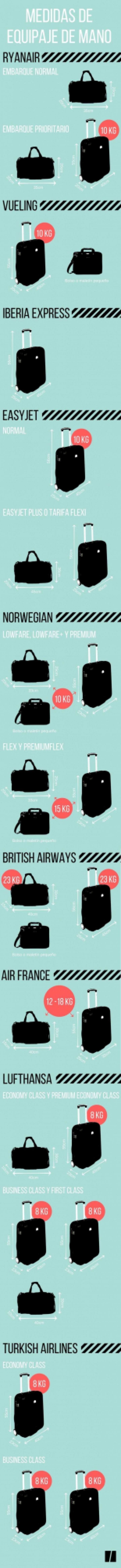 Ante la confusión y las dudas que puedan surgir a la hora de hacer la maleta, aquí puedes consultasr las medidas permitidas en las distintas aerolíneas para el equipaje de mano.