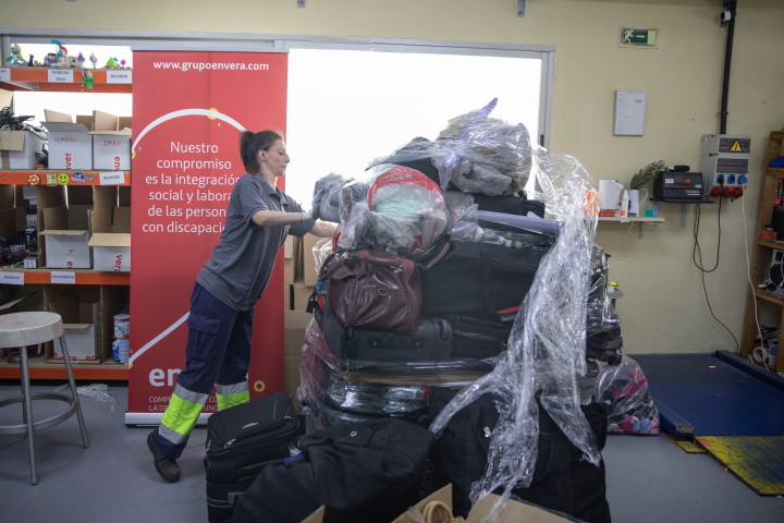 Cada semana llegan a este punto unos cuatro palés embalados con cientos de objetos. Marta, una de las cuatro personas que trabajan en este lugar, no sabe, ni sabrá nunca, a quiénes pertenecieron. Por sus manos han pasado cientos de maletas y bolsos extraviados en aviones y aeropuertos que nunca fueron reclamados y que, tras pasar el plazo legal, pasan a pertenecer a Envera, una entidad sin ánimo de lucro que lucha por la integración sociolaboral de las personas con discapacidad.