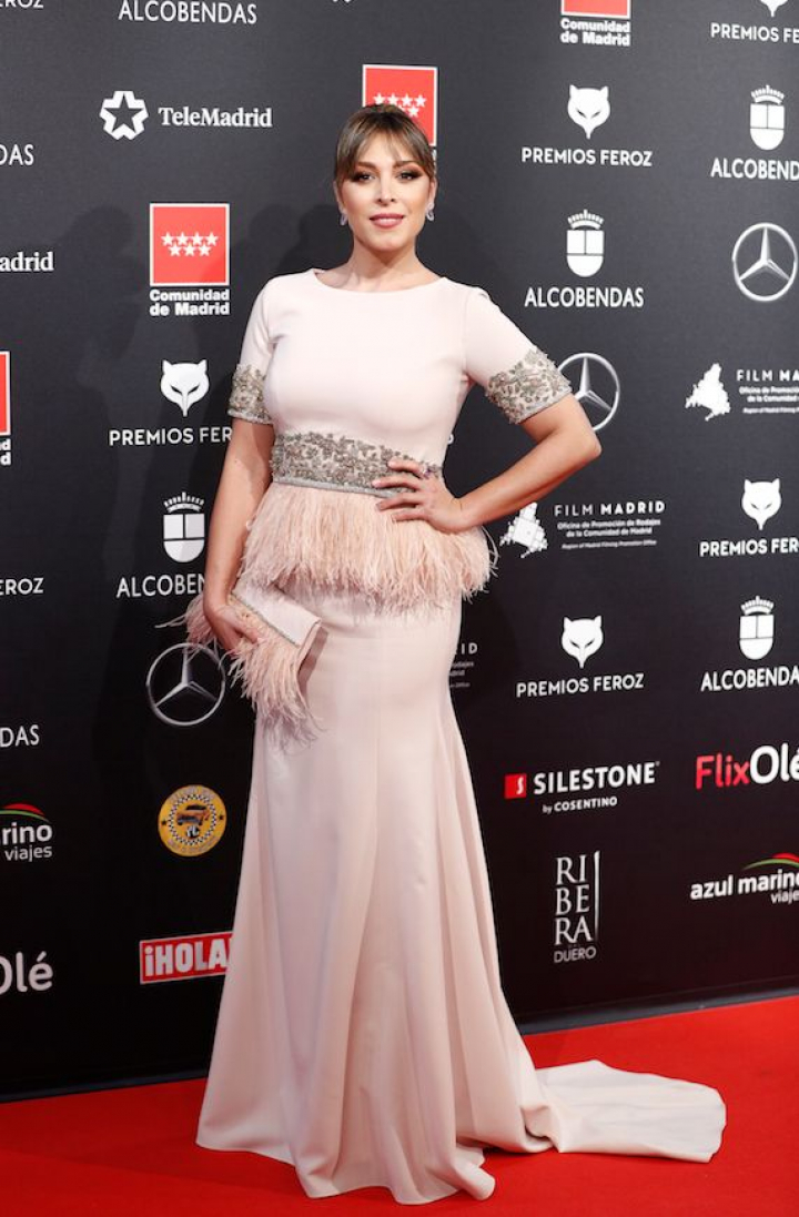 Muchos se han hecho las mismas preguntas al ver a la triunfita desfilar este jueves por la alfombra roja del Teatro Auditorio Ciudad de Alcobendas con este diseño rosa palo de la firma de Alta Costura Cristina Tamborero.