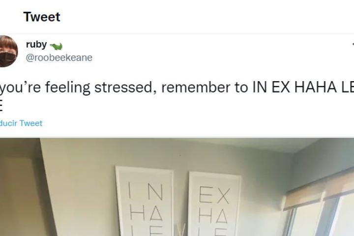 La usuaria de Twitter @roobeekeane publicaba este sábado la fotografía de los dos grandes cuadros que cuenta ya con más de 150.000 ‘me gusta’. “Si te sientes estresado, recuerda IN EX HAHA LE LE”, escribía en el tuit. La lectura correcta sería de arriba abajo y ambos cuadros por separado, a pesar de que al estar tan próximos pueda parecer que forman parte de una misma frase.