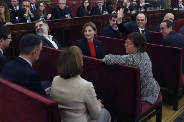 De los doce acusados, únicamente el exlíder de la ANC y diputado de JxCAT Jordi Sànchez luce pequeño un lazo amarillo, mientras los tres exconsellers que no están en prisión provisional -Santi Vila, Carles Mundó y Meritxell Borràs-, no llevan ningún símbolo político en su vestimenta.