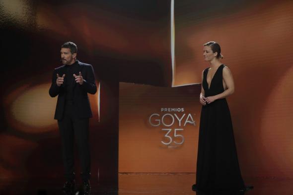 Antonio Banderas y María Casado tenían por delante la gala más atípica de la historia de los premios Goya: una ceremonia sin nominados y sin asistentes al teatro más allá de las contadas actuaciones y los entregadores que han solventado en poco más de dos horas.