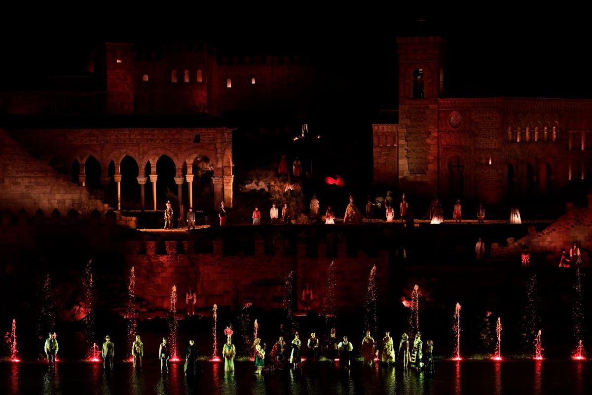 La puesta en escena corre a cargo de 185 intérpretes, entre actores, bailarines y jinetes, que dan vida a más de 2.000 personajes y que se mueven por un enorme escenario que a veces cuesta abarcar con la vista. No se le puede quitar el ojo porque también hay juegos de luces y sombras, 35 caballos y fuegos artificiales.