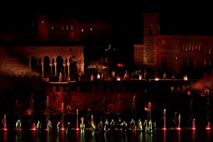 Claro que Puy du Fou no tiene nada que ver con esos gigantescos parques llenos de atracciones y tiendas de comida rápida. Por mucho que este espacio a 10 kilómetros de Toledo ocupe 55 hectáreas y que tenga una zona de restauración a la que llaman El Arrabal, el Puy du Fou es por ahora un único espectáculo nocturno de unos 80 minutos que recorre más de 1.500 años de historia a velocidad de vértigo. Sin apenas tiempo para respirar y siempre con Toledo como telón de fondo.