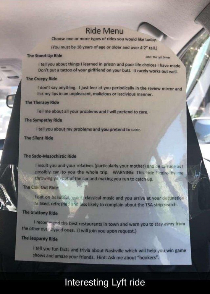 La iniciativa John, conductor de la compañía de VTC estadounidense Lyft quiere acabar con los momentos incómodos con sus pasajeros y ha colocado en su taxi lo que llama “Menú de viajes” (Ride Menu). Eso sí, para acceder a ellos tienes que tener más de 18 años y subirte a su coche en Nashville (Tennessee, EEUU).