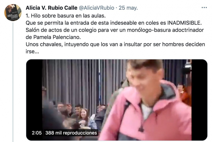 En un hilo de Twitter, Rubio decía que lo que hace Pamela Palenciano en los colegios es “basura” y la llamaba “indeseable” o “mamarracha”. Adjuntaba un vídeo sacado de contexto de una de las actuaciones de Palenciano en Linares hace dos años.