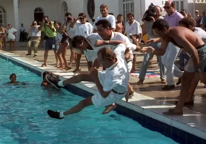 En 1993 famosa se hizo la foto del momento en el que Campos tiró al entonces monarca a la piscina del Club Náutico de Palma tras ganar la Copa del Rey para cumplir con la tradición de tirar al patrón al agua.