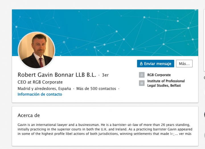 Gavin Bonnar, de 52 años, vive en Madrid, aunque por cuestiones laborales viaja con frecuencia a Londres, Dublín, Barcelona (donde vive Telma Ortiz) y Ciudad del Cabo. Es CEO en RBG Corporate, una productora relacionada con la música.