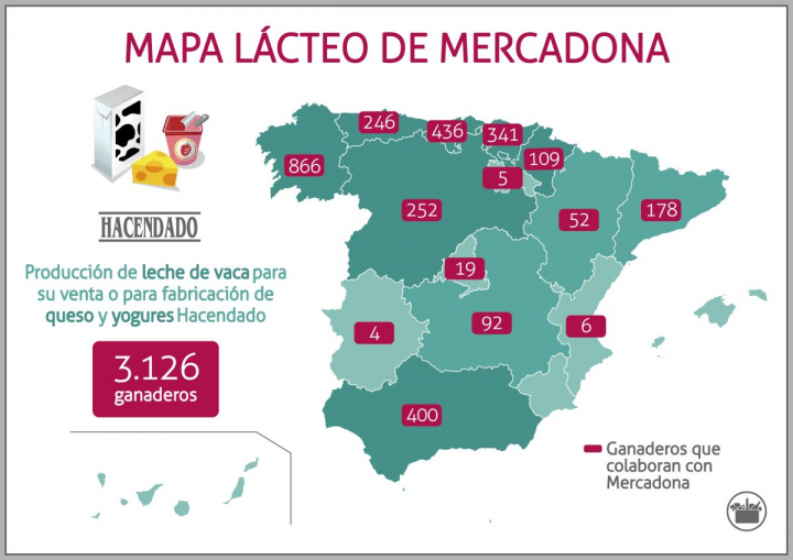 La cadena de supermercados de origen valenciano, que cuenta actualmente con una red de 1.635 tiendas, difundió hace unos años un mapa en el que detallaba el lugar de procedencia de la leche de vaca que se vendía bajo la marca Hacendado. El objetivo era contrarrestar falsos rumores que entonces aseguraban que la leche de Mercadona tenía origen portugués o francés. En realidad, toda la leche de esta enseña es de procedencia española.