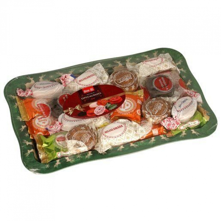 La cadena de supermercados Dia vende tres referencias de polvorones en su red de más de 4.300 tiendas en España. Una de ellas es la bandeja de selección de especialidades de 700 gramos (en la imagen), que incluye mantecado tradicional, hojaldrada, mantecados de canela, polvorón de vino y rosquilla bañada en chocolate. Cuesta 4,65 euros (6,64 euros/kilo).