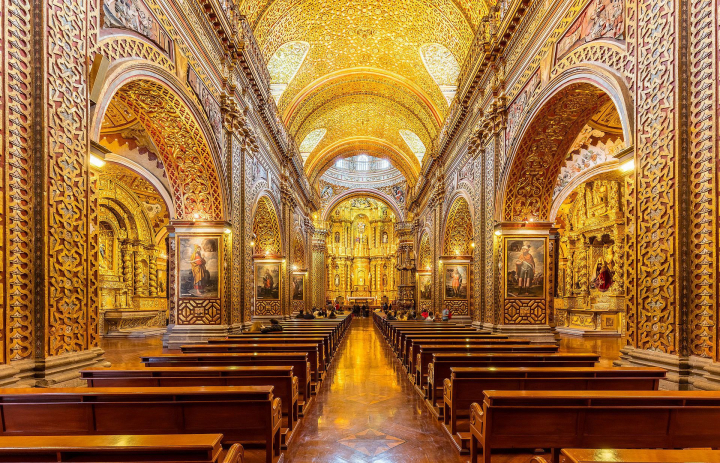 Una de las cosas que diferencian el patrimonio de Quito de otras grandes ciudades latinoamericanas es la decoración interior, generalmente austera en todo el continente. Muchos de los ornamentos interiores de los templos de la capital ecuatoriana dejan en evidencia a los palacios barrocos europeos. Dos ejemplos de esta suntuosidad son el Monasterio de San Francisco y sobre todo la Iglesia de la Compañía de Jesús, cuyas naves interiores están totalmente cubiertas con pan de oro de 23 quilates. Aquí los Jesuitas hicieron una excepción a su voto de pobreza.