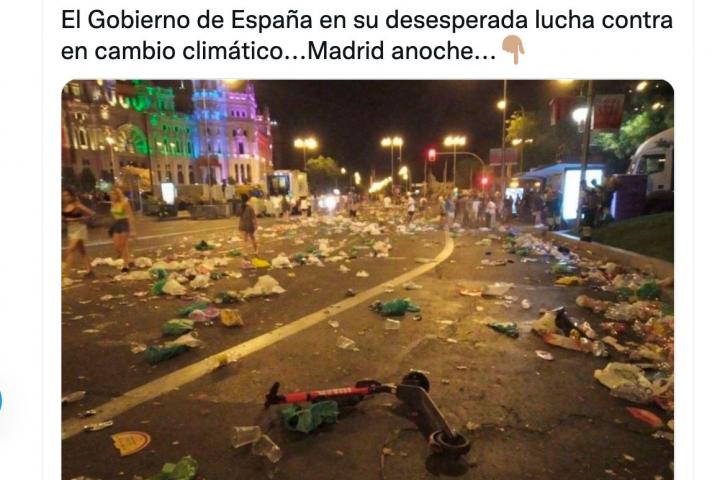 Junto al texto, una fotografía en la que vemos la plaza de Cibeles, frente al Ayuntamiento de la capital iluminado con los colores de la bandera LGTBI, llena de basura.