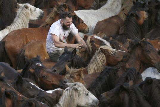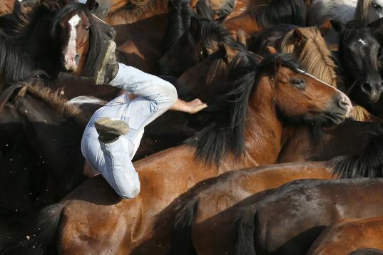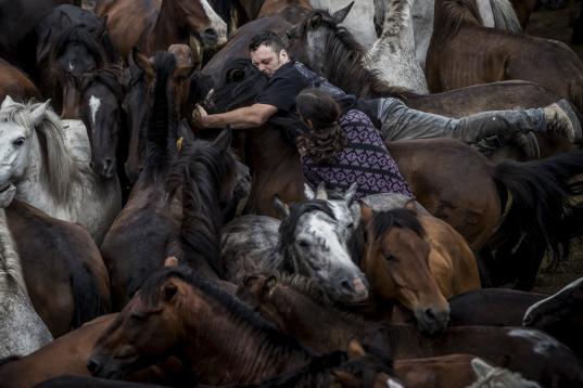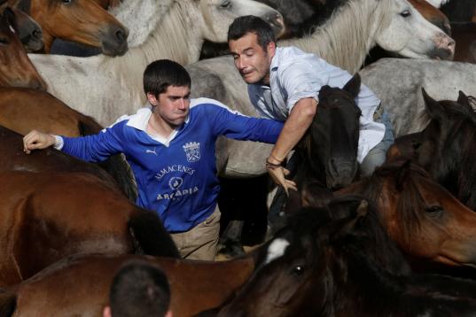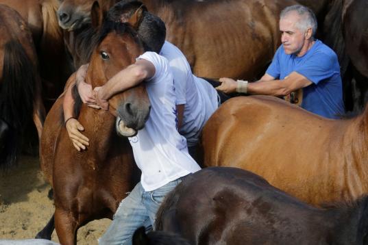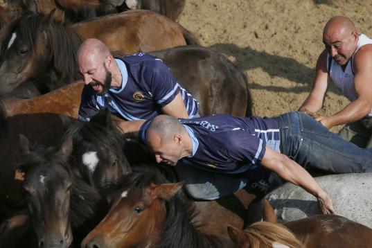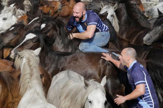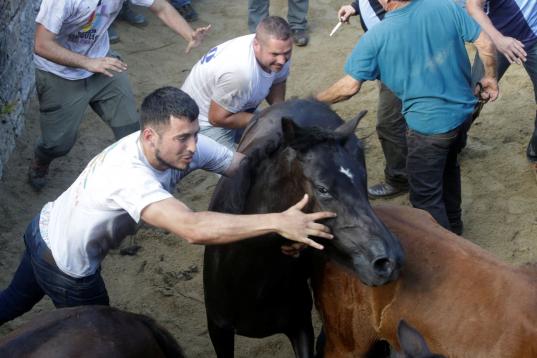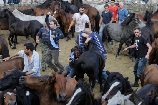 La parroquia pontevedresa de Sabucedo ha celebrado hoy el primero de los curros (los recintos cerrados donde se recogen los caballos) de la 450ª edición de la Rapa das Bestas, una fiesta declarada de interés turístico internacional y en la que caballos salvajes y 'aloitadores' miden sus fuerzas en un combate cuerpo a cuerpo.