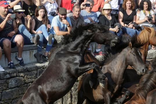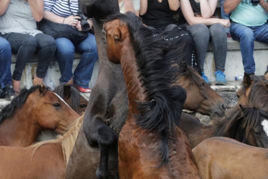 Durante hora y media, los aloitadores y los caballos salvajes de los montes de Corvos, Fontefría, Piorneira, A Conla, Souto, O Cádavo y A Planzadoira, se enfrentaron en la arena de O Castelo, entre los aplausos y vítores del público que jaleaba la valentía de los jóvenes ante las embestidas de los equinos.