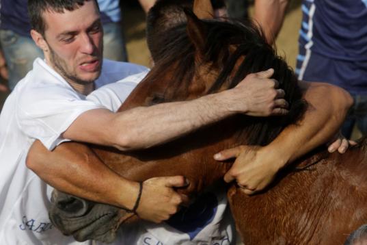Tras revisar la posición de las reses, dos aguerridos jóvenes se abalanzaron sobre uno de los caballos salvajes para aferrarse a sus crines, y mientras que un tercero sujetaba con firmeza el rabo del animal, el resto de compañeros rodeaba esta refriega inicial para evitar que los protagonistas pudiesen ser golpeados por el resto de la manada.