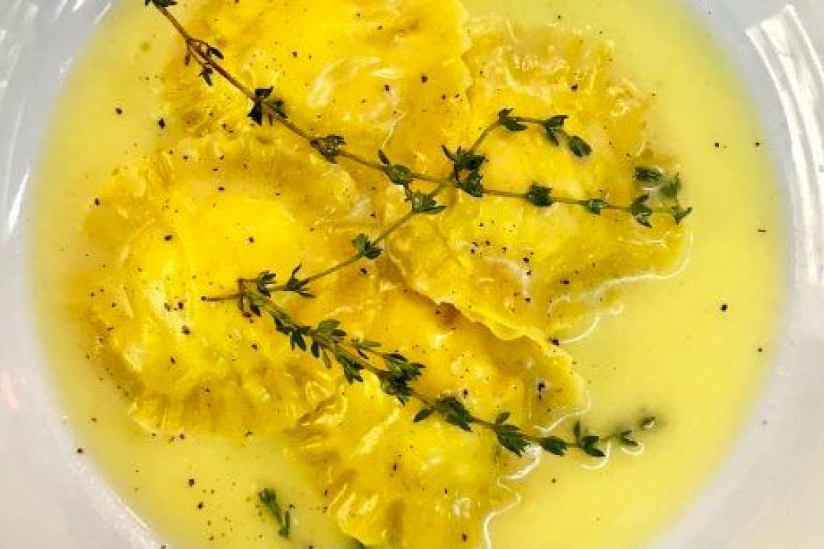 Ravioli de jamón ibérico, ricota, mantequilla y tomillo limonero