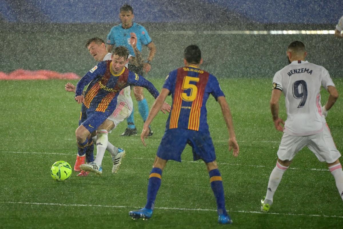 Bajo una torrencial lluvia el Madrid dio un vuelco a la Liga a la espera de lo que haga este domingo el Atlético de Madrid ante el Betis y los blancos dormirán líderes de la tabla tras vencer 2-1 al Barça en un ‘clásico’ muy intenso.