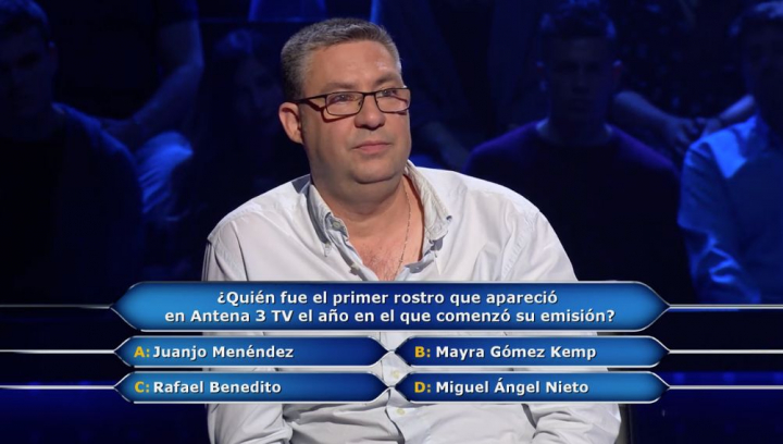 Benito se fue a casa con solo 1.500 euros tras fallar en la pregunta número 11, la de los 30.000 euros: ”¿Quién fue el primer rostro que apareció en Antena 3 TV el año en el que comenzó su emisión?”.
