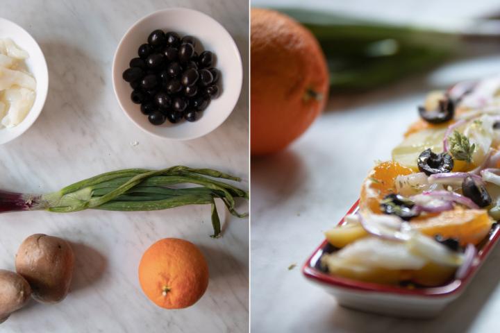 - Monta el plato: primero pon la patata en láminas, luego los trozos de bacalao, los gajos de naranja (cuidado que no tengan pieles), las aceitunas troceadas y la cebolla