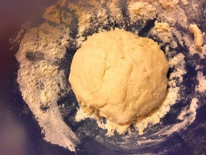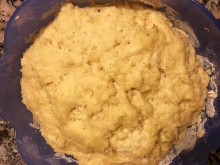 5. Una vez que ha doblado su volumen, volver a amasar bien para desgasificar la masa: ahora estará mucho más elástica y nada pegajosa, por lo que se podrá trabajar bastante bien para darle forma.