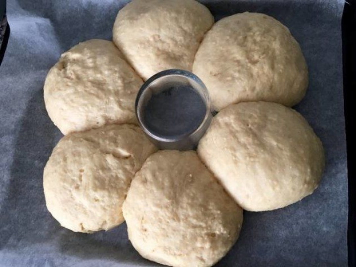 6. Para hacerlo en forma de flor, basta con hacer porciones de masa. En este caso fueron seis: como la masa final pesó un kilo, salieron seis bolas de unos 170 gramos cada una. En el centro basta con poner un aro de cocinar o, si no tienes, un vasito chato untado de aceite para que no se pegue. Debajo, forra la bandeja del horno con papel vegetal. Mete la bandeja con el roscón en el horno apagado y déjalo levar toda la noche.
