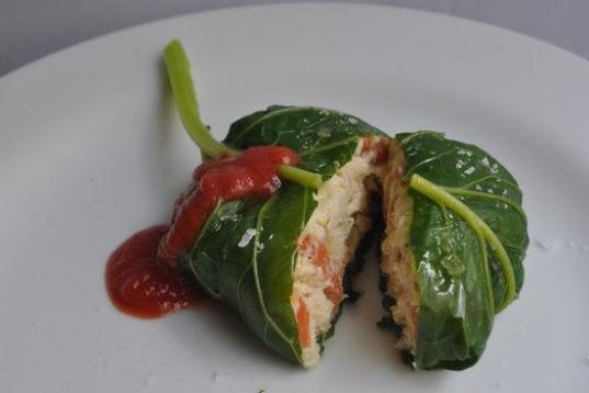 Se envuelve en hojas de col rizadas. Aquí puedes ver la receta.